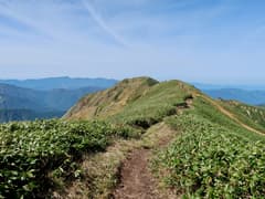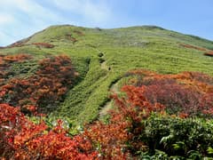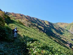 芝倉沢の渡渉点から続いた急登も、笹原に覆われた一ノ倉岳の頂上が見え始めると、傾斜が緩んで一段落。笹原を綺麗に切り開いた道を辿る。紅葉の小岩峰を越え、最後は笹原が広がる斜面を登って、一ノ倉岳の頂上に着く。
