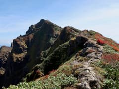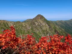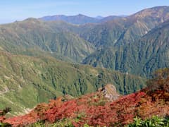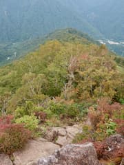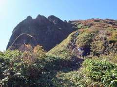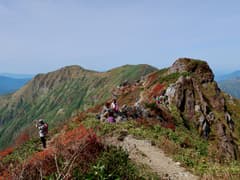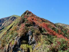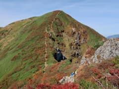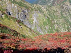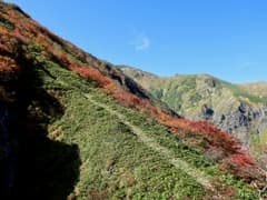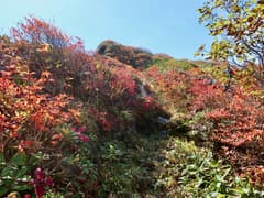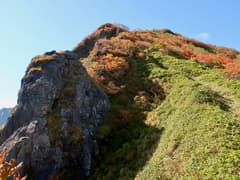 紅葉を愛でる尾根道はまだまだ続き、特に右側の斜面を覆う紅葉は見事だ。芝倉沢の周囲の岩場や笹原の緑もいいし、互いに引き立て合っているな。