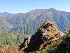 やがて頭上に小尾根の左に突き出た岩峰群が現れる。これが堅炭岩かな。ずっと付いてきたハイカーさんの先に出させて貰い、急登して堅炭岩の岩頭の近くに出る。眼下に横たわる湯檜曽川を隔てて、白毛門、笠ヶ岳、朝日岳と続く山並みが遮る物なく眺められる。そしてこの辺りから紅葉の間を縫って登り、岩場を交えた尾根道となる。