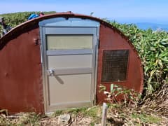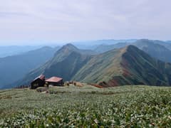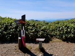 頂上は東西に長く平坦な笹原で、どこが最高点かはっきりしない。登り着いた所に山名標識、カマボコ型の避難小屋、「遭難之碑」石碑がある。三角点標石は見そびれた(後日、点の記を見ると、茂倉岳へ19m寄った所にあるらしい)。展望はもちろん360度。先月登った茂倉岳がすぐ近くに見える。主稜線なので、ハイカーさんの往来が多い。