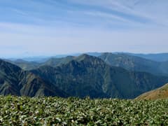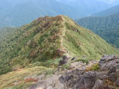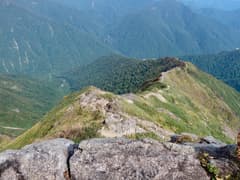 標高が上がるにつれて、芝倉沢の上流や茂倉岳と武能岳を結ぶ主稜線、振り返れば七ッ小屋山から清水峠、朝日岳へと連なる山並みが眺められる。岩場を鎖でトラバースし、小尾根を絡んで急登する。途中で後続のハイカーさんに道を譲る。