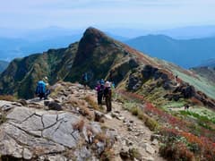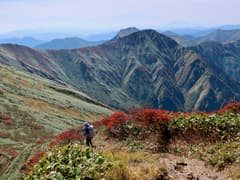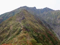 一ノ倉岳の下りから眺める谷川岳は、左側が一ノ倉沢の荒々しい岩壁、右側は笹原に紅葉を混じえ、これまた絶景。前を行く単独行の女性も、度々スマホを構えて撮影している。