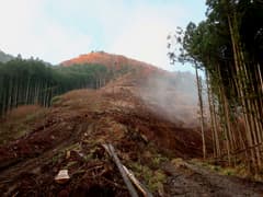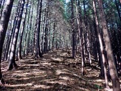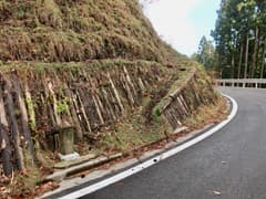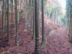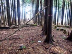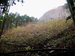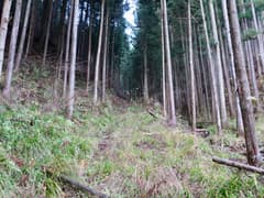 伐採地が終わって、杉植林帯に入る。程なく、右手に下る作業道が現れるので、これを下る。作業道は大きくジグザグを切りながら、山腹を下って行く。枝道が多く、登りでは進路に迷いそうだが、下りはとにかく下へ向かうだけなので、ルートファインディングは必要ない。所々の大きなカーブは杉林と草藪の斜面を直下降して、ショートカットを図る。