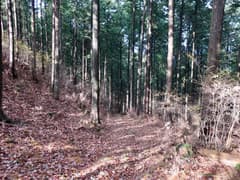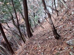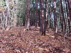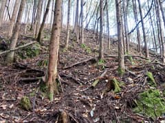 しばらく杉林の中を進むと、右斜面は古い伐採地となる。これを過ぎると、谷の中に倒木が増えて歩きにくくなり、また、このまま詰め上がると高谷山の頂上直下の急斜面に突き当たるので、適当なところから右斜面に取り付いて、小尾根上まで強引に急登する。