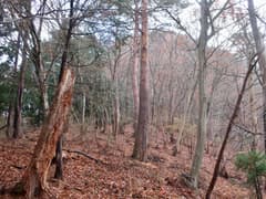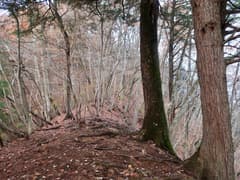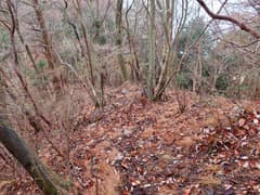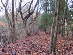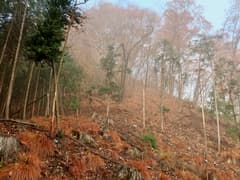 登り着いた小尾根の右斜面は先程の古い伐採地となる。小尾根を登ると雑木林に入り、藪もなくていい感じの尾根歩きとなる。二股から最初の伐採地の尾根を登ってもこの辺りに合流し、近道で傾斜も緩そうなので、気が進まないなどと言わずに、あそこから登った方が良かったかな、とコース取りを反省。