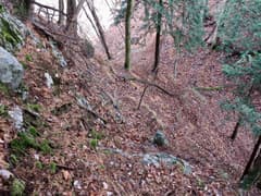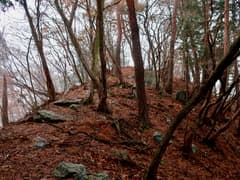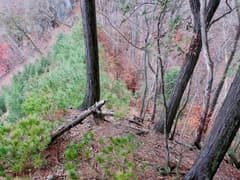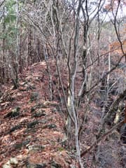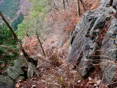 キレットに向かって急降下する。左斜面は松の幼樹が密生して、ちょっと藪っぽい。キレットの底は明るい雑木林でそこそこ広く、両側が切れ落ちているということはない。正午に近く、腹も減ったのでここで昼食にしようかとも思ったが、難所が控えていると落ち着いて食事できなさそう。ということで、気合いを入れて登ってしまうことにする。