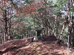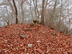 頂上は落ち葉に埋もれた小広い平地となり、丸石を納めた石祠と三角点標石がある。また、ほとんど消えかかった文字で「高谷山」と書かれた山名標と古い温度計が木の幹に取り付けられている。温度計は、正しい値かどうかは定かでないが、4℃を示している。まだ靄がかかって陽射しは弱いが、風はないのでそれほど寒くはない。靄に加え、元より樹林に覆われているので、展望はない。