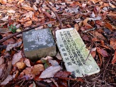 やがて傾斜が緩んで、なだらかな尾根を辿る。杉林に覆われた尾根を緩く登ると、三角点によく似た標石がある。近くに看板が落ちていて、前橋営林署が設置した図根点(ずこんてん)だそうだ(この後、谷倉山までの尾根上で多数の図根点標石を見る)。