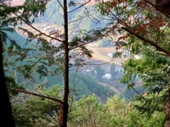 杉林に覆われた尾根を登り、丈の低い笹が現れると548m標高点のピークで、ここにも図根点がある。緩く降って鞍部に着くと、右側のすぐ下に作業道が通る。尾根を直進すると急坂となり、上部には露岩も現れる。登り着いた小ピークでは、左側の木の間を透かして山麓の集落を俯瞰する。こちらの斜面はかなり急そうだ。