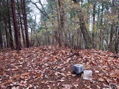 ここから杉植林帯の広い斜面をひと登りして、谷倉山の三角点標石のある平坦な頂上に着く。杉林に覆われた地味〜な佇まいの頂上で、南東キレットと東尾根末端の二つの難所のある山とは思えない。このギャップが、私が谷倉山を怪峰と思っている所以でもある。