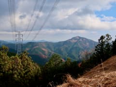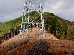 相変わらず杉林に覆われた緩いアップダウンの尾根が続き、いささか単調さを覚える。もう一つ図根点標石を過ぎると、送電鉄塔(新栃木線190号)に着いて、小休止とする。左右の樹林が切り開かれて眺めが良く、気分転換になる。左(西)には尾出山から高原山にかけての稜線、右(東)には端正な三角形の山容のハナント山や、遠くに二股山、古賀志山が眺められる。