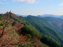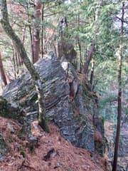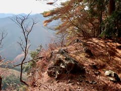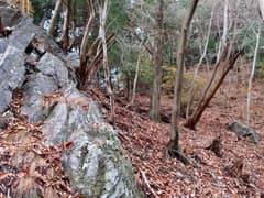 小ギャップから急坂を登り返して小ピークに登り着くと、木の間からキレットを隔てて谷倉山が眺められる。谷倉山の手前に三つの∩状のピークが連なり、なだらかな山が多い安蘇山塊においては特異な険しさを見せる。キレットに面する件の岩場も見えている。