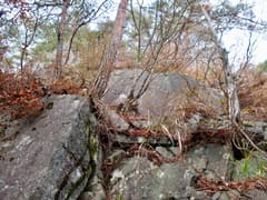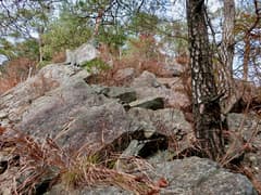 雑木林に赤松が混じって生える尾根を辿ると、キレットの岩場が眼前に現れ、よく偵察しておく。正面の岩壁はとてもじゃないが登れない。左下の松が生えている辺りを登って、岩壁の左上に上がるのが多分ルートだろう。
