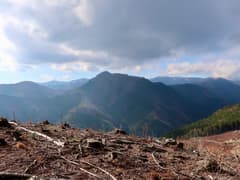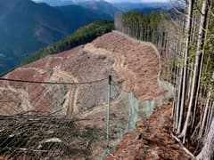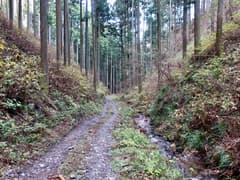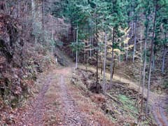 やがて谷は二股となり、正面は広大に伐採された緩い尾根となる。林道は右の谷に入って行くので、これを辿ると、泥の急斜面に突き当たって終点となる。この先に進むのは無理だ。二股に引き返して、伐採地の尾根を登ろうかと思ったが、工事現場そのもので殺風景でぬかるんだ斜面を登るのは、どうも気が進まない。左の谷に沿って古い林道があるので、これを辿ってみる。
