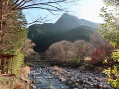 定刻より数分遅れてバスが到着。普通の路線バスの大きな車両だが、乗客は私一人だけ。バスは蛇行する思川に沿って走る。入山予定地の鬼平バス停で下車するため、降車ボタンを押すべく車内放送を待っていたら、さり気なくすっ飛ばされて、危うく素通りするところだった(^^;)。乗車時に、下車するバス停を告げておいた方が良さそうだ。まあ、バス停でバスを待っていて、バスに素通りされることに較べれば、些細なことではある。