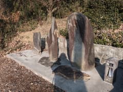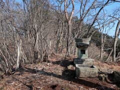 岩稜を登り、傾斜が緩むと水盤と石祠がある。石祠は、屋根の棟の上に鳥居の笠木の形の石が載ったもので、この型の石祠を見るのは初めてかも(そういえば、尾根取り付きの石祠も、笠木形のパーツが外れて屋根の上に置いてあった)。