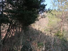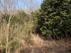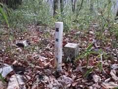 バス停から車道を歩き始めると、正面にこれから登る大倉山の南東尾根、その右奥に大倉山の頂上付近が眺められる。「八百比丘尼の里」方面に直進すると、ネットの情報どおり、尾根末端の民家の左に庚申碑があり、ここから尾根に取り付く。最初の平地は灌木と雑草の藪が酷いが、尾根を登り始めると疎らな雑木林に入って歩き易くなる。