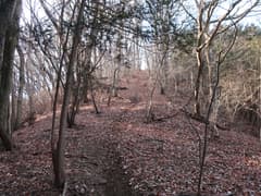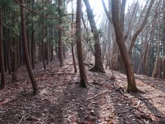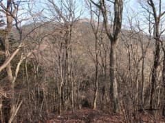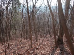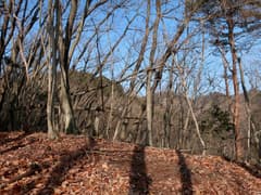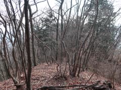 冬枯れの雑木と緑のヒサカキに覆われた尾根を、小さくアップダウンしながら登って行く。樹林に覆われて展望は乏しいが、所々で木立を透かして行く手の尾根や奥の大倉山が見える。左下の山麓のグラウンド(真名子運動広場)では野球?の試合が行われているようで、応援の掛け声が微かに聞こえてくる。