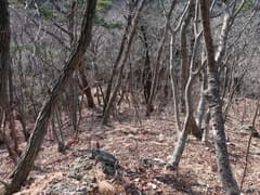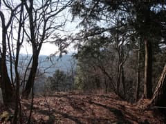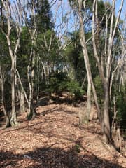 話の流れでハイカーさんと連れ立って市境尾根を西に下る。幅広い尾根をゆるゆる下ると、最低鞍部辺りで左に芳姫の墓経由の沢沿いのコースが分岐する。そちらは前回登ったので今回はコースを変え、みつまんさんの山行記録を参考にして、市境尾根を末端まで下る所存。沢コースを下るハイカーさんと別れ、465m標高点峰へ短い急坂を登る。振り返れば、既に谷倉山が意外と遠い。
