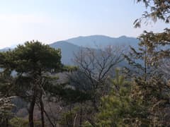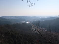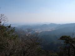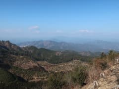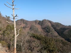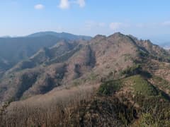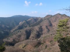 やがて岩場が現れる。左に赤松が生えた露岩の多い枝尾根が分かれ、そちらに立ち寄ると山麓の眺めが良い場所がある。主尾根に戻って小さな岩場を登る。変化に富んで、なかなか楽しい尾根だ。ただし、時々遠くでパーンと銃声が響くのが気に掛かる。尾根の左方には谷を隔ててゴルフ場が広がるが、このご時世、ゴルフ場は廃業して太陽光発電所に変わっているようだ。また、右方には小ピークを連ねた市境尾根が延びる。