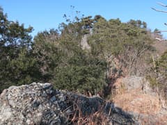 稜線を辿ると、梢越しに谷倉山が少し近づいて眺められる。再び岩場が現れ、左からザレた急斜面を下る。痩せた岩尾根を登り、小さくアップダウンを繰り返し、479m標高点峰の西峰に着く。樹林に囲まれた狭い頂で、あまり特徴のないピークだ。