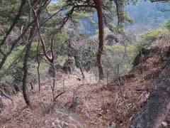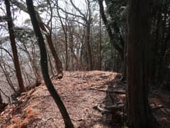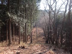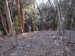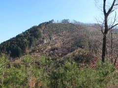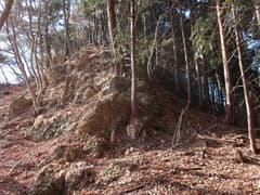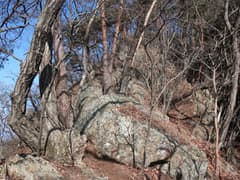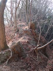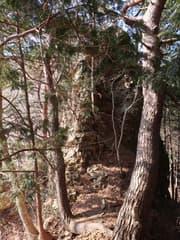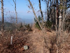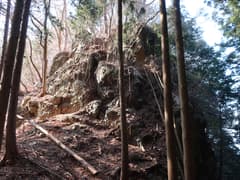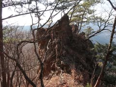 伐採地を抜けると雑木林と檜植林の境の尾根となり、藪のない歩き易い登りとなってホッとする。木立を透かして見える行く手の山は結構高い。露岩混じりの尾根を急登し、赤松に覆われた小ピークを越えると、尾根上に岩塔が立つ。ここから、479m標高点峰を中心とする三峰の岩場が連続する。岩塔の左を巻いて鞍部に下ると「久野小松神社社有地」「平成十九年三月吉日建立」と記された木の標柱が立つ。