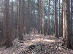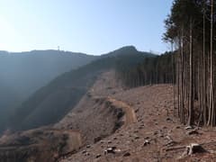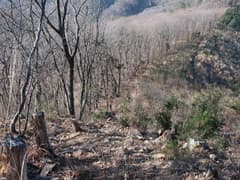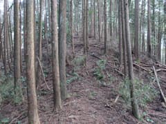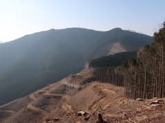 林道向かいの法面の登れる所を探してうろうろ。コンクリートブロックの林道標識からちょっと滑り易い踏み跡を登って、尾根上に復帰する。しばらく広大な伐採地の縁を歩く。まだ藪はないが、丈の低いイバラ類が生え始めて、大倉山の西のような藪漕ぎになるのも、そう遠くなさそう。