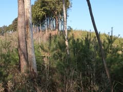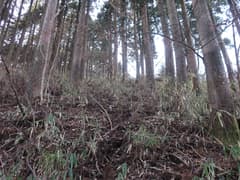 展望を楽しんで一休みしたのち、479m標高点峰に向かって西面の伐採地を適当にジグザグを切って急降下する。下り着いた鞍部からスズタケと松の幼樹の藪に突入する。これは昨年2月の葛生の低山以来の酷い藪漕ぎだ。