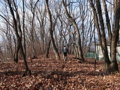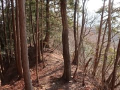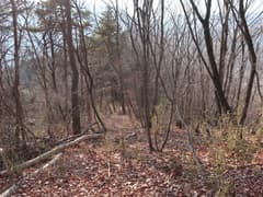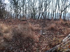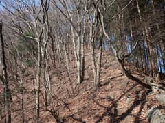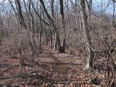 465m標高点峰からの下りは、最初は尾根が広くて方向を定めにくいが、雑木林の枯葉を踏んで緩斜面を下るのは快適。やがて尾根筋がはっきりして、一部に痩せた区間もある。