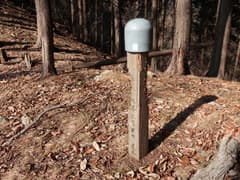 登山道を緩く登って、谷倉山の頂上に着く。三角点標石のある頂上の広場は適度に草が生えて、こちらはちょっと雰囲気が良くなっている。丸太に座って一休みしていると、西側からソロのおじさんハイカーさんが登って来た。話を伺うと、星野遺跡から芳姫の墓経由で登って来たが、途中で道がわからなくなって、西の市境尾根を上がったそうである。また、 前回は沢沿いの倒木で苦労したので、そのことを伺うと、今は問題ないそうである。