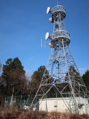 幅広い尾根を辿って緩く登ると広大な伐採地の上に出て、眼前になだらかな山容の谷倉山が現れる。頂上の電波塔も近くなって良く見える。ここが500m標高点峰の頂上だ。殺風景ではあるが、まだ新しい伐採地なので藪が全くなく、歩き易い。緩く下って、舗装された林道真上男丸柏木線に出る。この林道は、地形図では南から市境尾根上までしか記載されていないが、北麓まで全通しているそうだ。