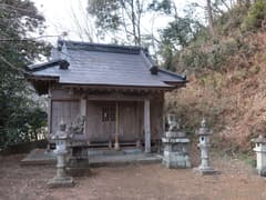 市境尾根末端の198m三角点標石を過ぎて直進すると、右下に県道、左下に星宮神社の屋根を見て、杉やアオキの急斜面を下る。測量で切り開かれたらしく、微かな踏み跡があるが、石を落とすと神社の屋根を直撃するので、慎重に下って神社の裏手に降り立つ。