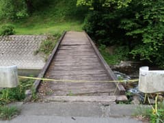 さて、ここから粕尾山へは、上粕尾へ稜線を越える地形図の破線路(峠道?)を利用してみるつもりである。県道を少し戻り、粟野川に架かる木橋を渡る。この橋は橋板が老朽化して、入口にはビニル紐が張られているので、渡る際は踏み抜きに注意。