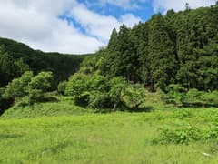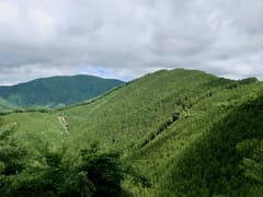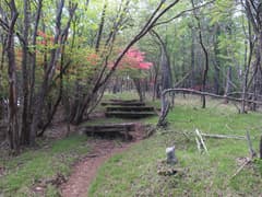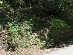 対岸の小道を右に進み、折り返して一段上がると、雑草に覆われた畑地跡が広がる。振り返ると、石裂山のギザギザの稜線が眺められる。微かな道型を辿って畑地跡を突っ切り、墓地の右側から尾根末端に取り付く。竹林に覆われた斜面に、そこはかとなく掘り窪んだ道型が残っており、これを辿ってジグザグに登って行く。
