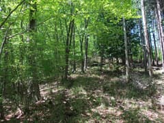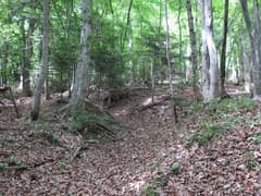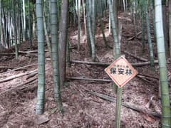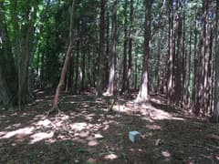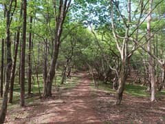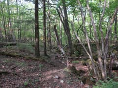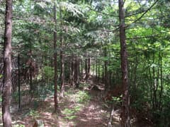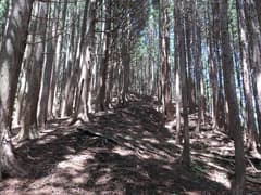 竹林を抜けて雑木林に入ると、掘り窪んだ道型がはっきりしてくる。落ち葉がフカフカに積もり、所々に大型のけものが寝た跡らしき大きく丸い凹みが残っている。やがて広い尾根に上がって、杉林の中を緩く登る。道型は薄くなるが、どこでも歩けるので問題ない。