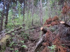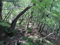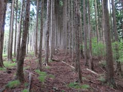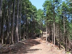 しばらく緩い登りが続くが、若い杉植林帯に入ると傾斜が強まり、小藪が煩くなる。縦横に付けられたけもの道を拾って登ると、林道横平線に出る。