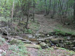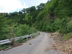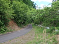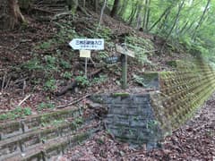 急降下して、ようやく傾斜が緩くなると、道は尾根から左に折れて沢に下る。すぐ下流には何かの建物が見えるが、そちらには行かず沢を渡る。山腹をトラバースし、小鞍部を越えて下ると、古峰ヶ原峠を越える県道草久(くさぎゅう)足尾線に出る。登山口には「三枚石新道(健脚者に限る)」との道標が建つ。確かに途中の尾根道はなかなか急だった。