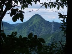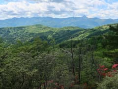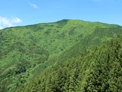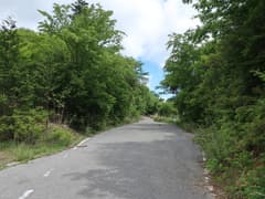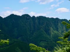 ここから右(北西)へ舗装された林道を辿る。すっかり濃くなった緑に覆われて、展望はほとんどないが、木立の切れ間から石裂山が眺められる個所がある。先週は、あのギザギザの上を辿った。やはり、なかなか険しい山である。