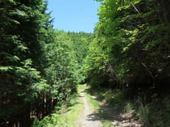 水を飲んで少し休んでから出発。植林に覆われた幅広い尾根をしばらく辿ると、未舗装の作業道の終点に出る。ここから林道前日光線まで、一部ショートカットした以外はこの作業道を辿り、楽するために957m標高点は左山腹を巻く。