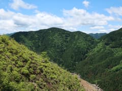 林道が再び稜線を越える所から、左の稜線に取り付く。稜線の左側は檜の若い植林帯で、しばらく防獣網に沿って歩く。藪はないが、この季節になると蜘蛛の巣が頻繁に顔に引っかかって鬱陶しい。