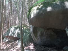 ぐんぐん登ると、花崗岩の大石が点々と現れ、中には雨宿りできそうな岩屋を成す巨石もある。杉林を抜け、新緑の雑木林と丈の低い笹原、ところどころ枯れスズタケの斜面を急登する。「日光社寺」の標柱が連続して建ち、何かの境界を表しているようだ。