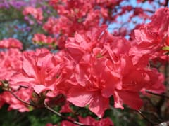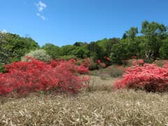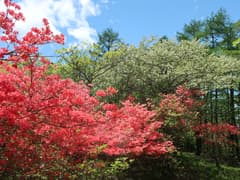 傾斜が緩むと井戸湿原の南の峰に登り着く。峰の上はヤマツツジが満開で、赤いトンネルの下を潜って進む。ズミの白い花も多く、青空に映える。