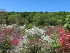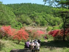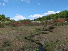 湿原へ向かって、カラマツ林と笹原の踏み跡を下る。防獣網をゲートで通過して湿原を周回する遊歩道に出ると、大勢のハイカーさんで大賑わい。湿原にはヤマツツジの他、トウゴクミツバツツジやシロヤシオ、ズミが群れて咲く。ヤマツツジはピーク、トウゴクミツバツツジは終盤、シロヤシオとズミはピークを少し過ぎといった所だが、見渡すと赤、紫、白、緑が混ざり合ってとても綺麗だ。ツツジの開花状況は全く調べてなかったが、運良くピッタシのタイミングで来たようだ(^^)