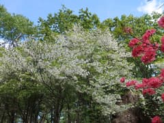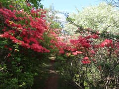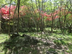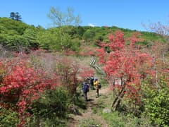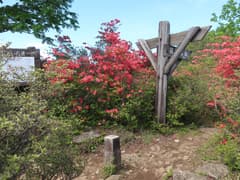三枚石へは広く平坦な稜線を歩く。こちらの道もヤマツツジとズミが満開で、あちこちで紅白のトンネルを潜る。