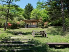 湿原荘跡には東屋とベンチがあり、すぐ近くの沢には水が流れている。既に午後1時で腹ペコ。ベンチの一つに腰掛けて昼食とする。今日は暑いし、ツツジを鑑賞しながら飲む缶ビールは最高だねえ。それと鯖塩焼き缶、カップ麺を食べる。