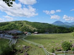 横根山から少し下って、牧場を見渡しながら前日光ハイランドロッジに向かう。山上に牧草地の緑がゆったりと広がり、日光連山を遠望する景勝地だ。車はハイランドロッジまで入れて、その先は車両通行止。ハイランドロッジの駐車場はほぼ満車となっている。