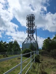 樹林の中を緩く登って、方塞山の頂上に到着。一番高い所には大きな電波塔が建つ。樹林に覆われているが、南面が開けて、牧場の向こうに象の鼻展望台が眺められる。