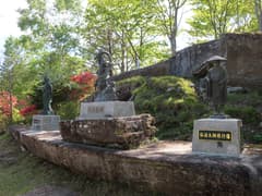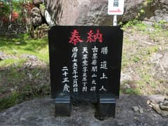 三枚石に着くと、女性ハイカーさん四人組が休憩中。「金剛山奥之院」の額と天狗の団扇が掛かる社の他、聖観音菩薩、弁天龍神、大白龍神、別雷神、弘法大師修行像、勝道上人古峯原開山之碑などの石碑、石像が目白押しに建つ。