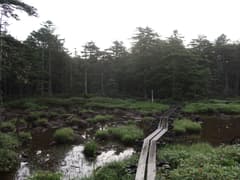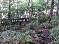 木道が尽きて笹原を切り開いた登山道を進む。笹の朝露で腿から下が少し濡れるが、気にしない。途中、左に分かれる山道があり、これが地獄谷への道のようだ(道標なし)。どんな場所か気になるので、立ち寄ってみよう。山道を少し登ると防獣網があり、地獄谷の自然保護のため設置されているとのこと。防獣網を開閉して通り、擂り鉢状の窪みの底に下ると、巨石を沈めた深い池が口を開く。冷気が沈殿して薄く靄がかかり、神秘的だ。