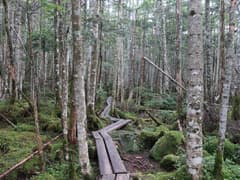 やがて急な階段を下って雨池峠への登山道に合流。このあとは雨池峠から縞枯山、茶臼山を越えて麦草峠に戻る予定だが、ちょっと道草。木製通路を辿って、ロープウェイ駅に行ってみる。子供の頃、家族でロープウェイ(当時はピラタスロープウェイという名だったと思うが、近年、北八ヶ岳ロープウェイに改称)で上がって坪庭を散歩したことがあるような気がするのだが、記憶はあやふや。坪庭や駅周辺に見覚えはなかった。